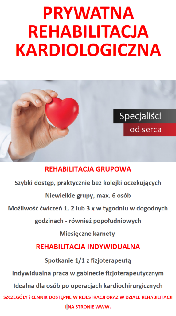 Od stycznia ruszamy z nową ofertą rehabilitacji kardiologicznej przygotowanej dla pacjentów po zawale i operacjach kardiochirurgicznych. Serdecznie zapraszamy do zapoznania się z ofertą i cennikiem.